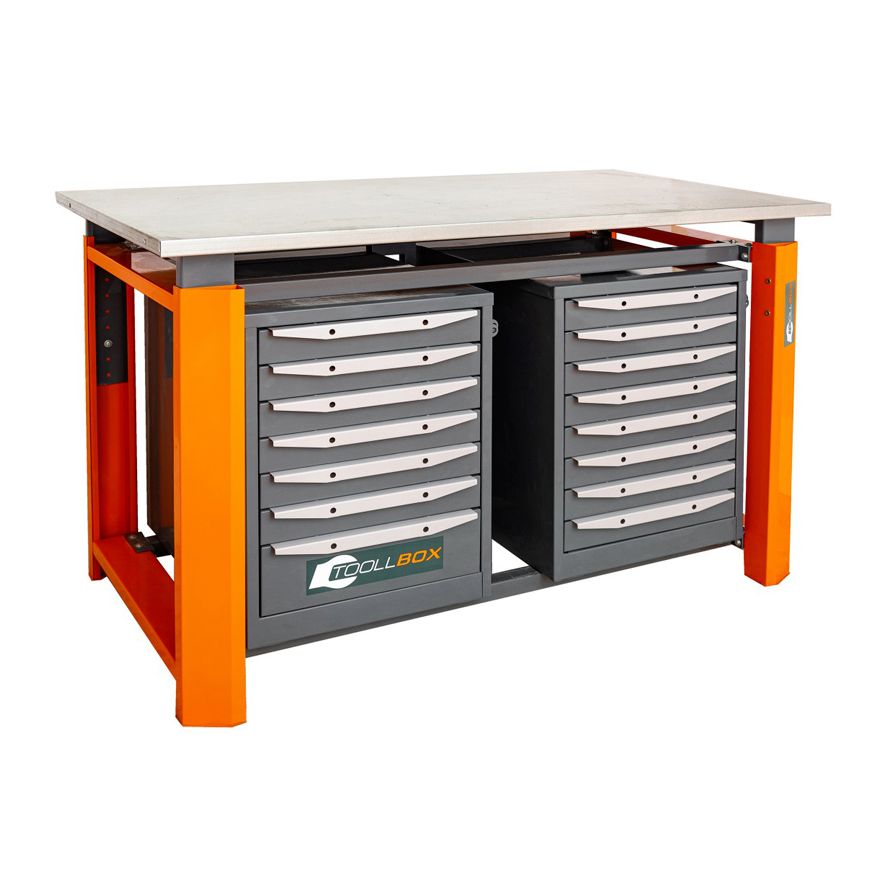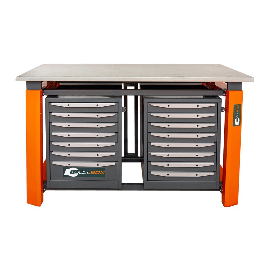 Одна тумба оснащена семью выдвижными ящиками, вторая — восемью. Такое исполнение позволяет удобно распределить инструмент, крепеж, измерительные принадлежности и расходные материалы по назначению, чтобы все необходимое находилось под рукой без лишней суеты. Обе тумбы снабжены петлями под навесной замок, что особенно удобно там, где важны порядок и ограниченный доступ к содержимому.