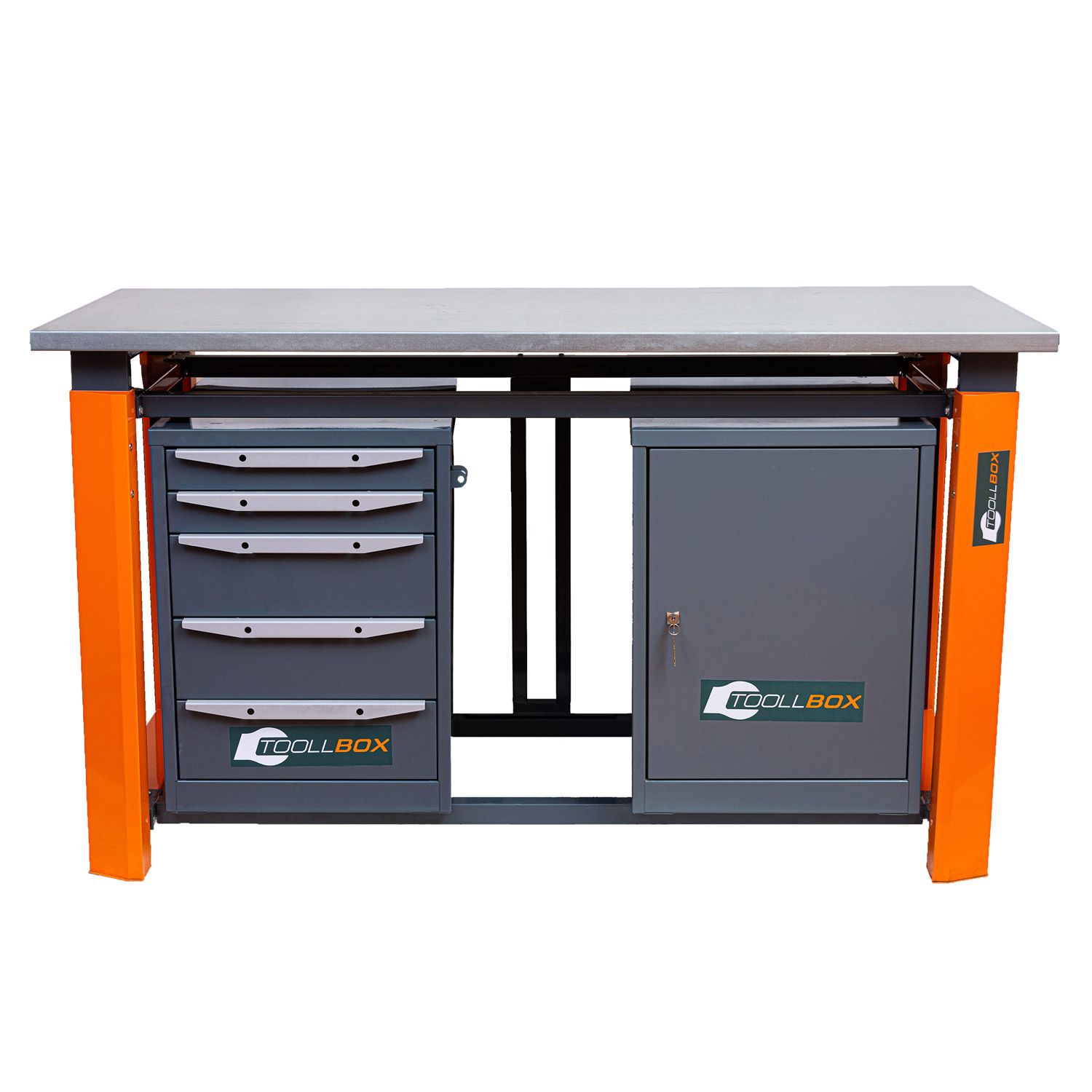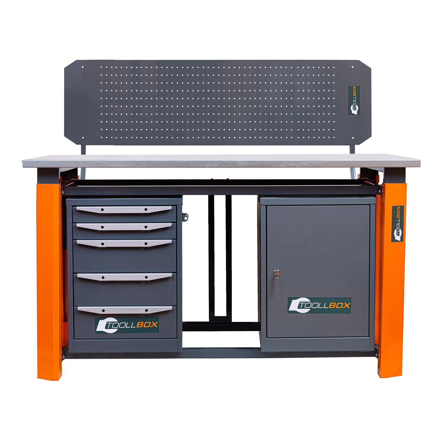 Такое исполнение делает верстак особенно практичным в ежедневной работе. Ящики подходят для метизов, ручного инструмента, оснастки и расходных материалов, при этом каждый из них рассчитан на распределенную нагрузку до 45 кг. Вторая тумба удобна для хранения коробок, кейсов, измерительного оборудования и всего того, что должно быть под рукой, но не занимать рабочую поверхность. Для дополнительной защиты содержимого одна тумба оснащена петлями под навесной замок, другая закрывается на врезной замок.