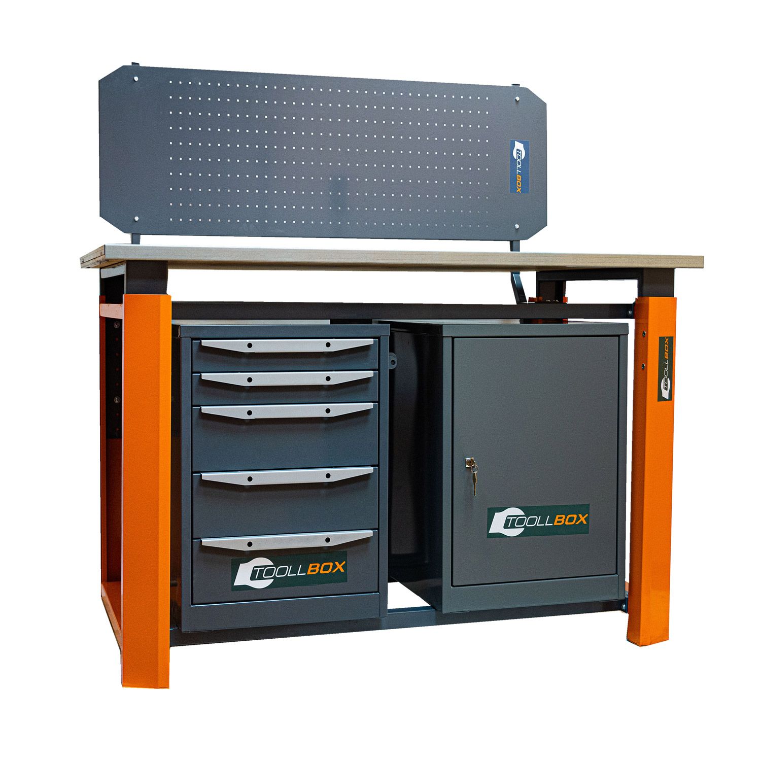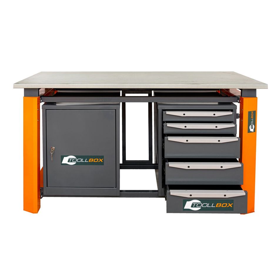 Верстак ТВР1800 (ТВ0-ТВ5) — добротное рабочее место для мастерской, гаража, сервисной зоны или производственного участка, где важны не только прочность конструкции, но и удобная организация инструмента. Эта модель сочетает вместительность, устойчивость и продуманную компоновку: с одной стороны установлена тумба с пятью выдвижными ящиками, с другой — тумба с дверцей и двумя полками для хранения более габаритных принадлежностей.