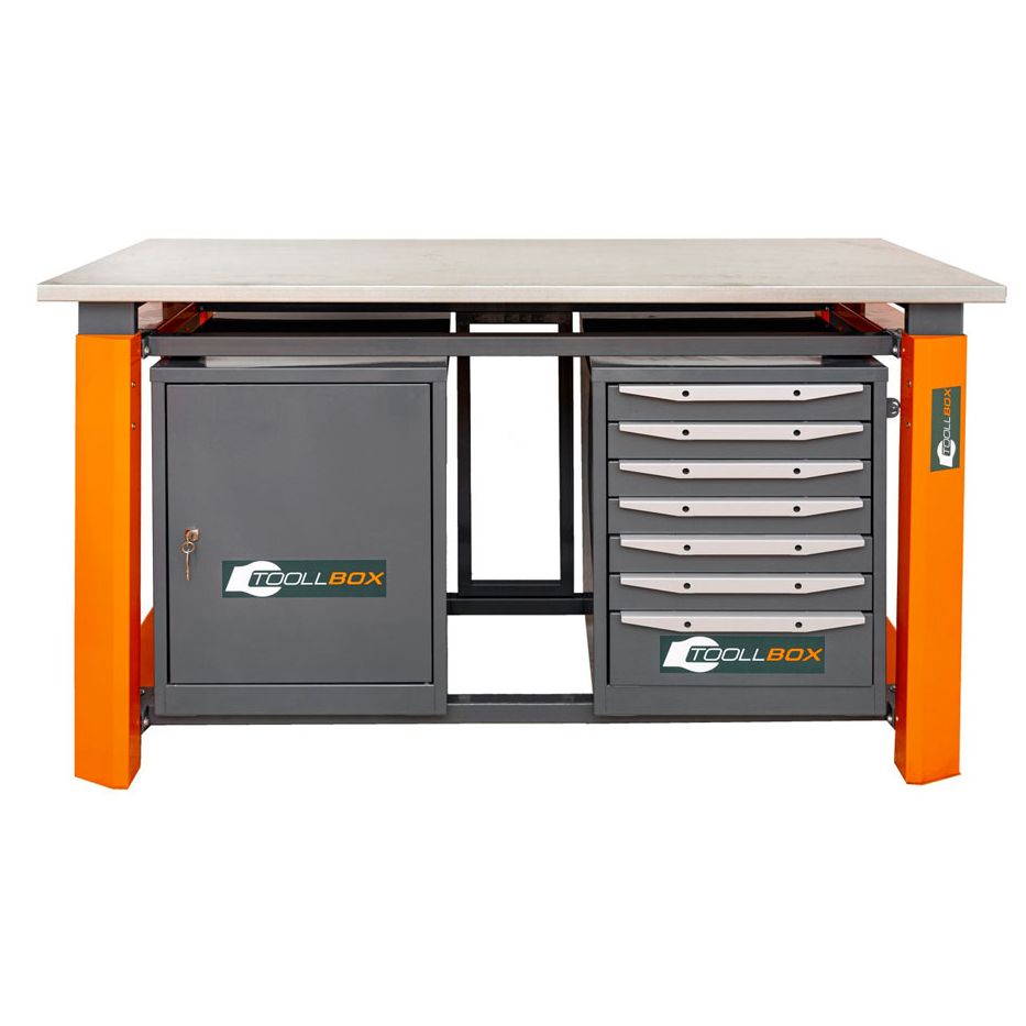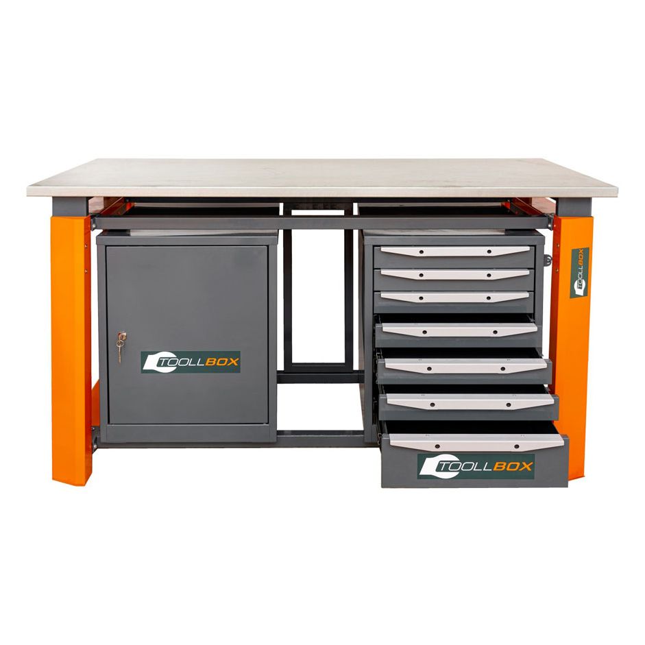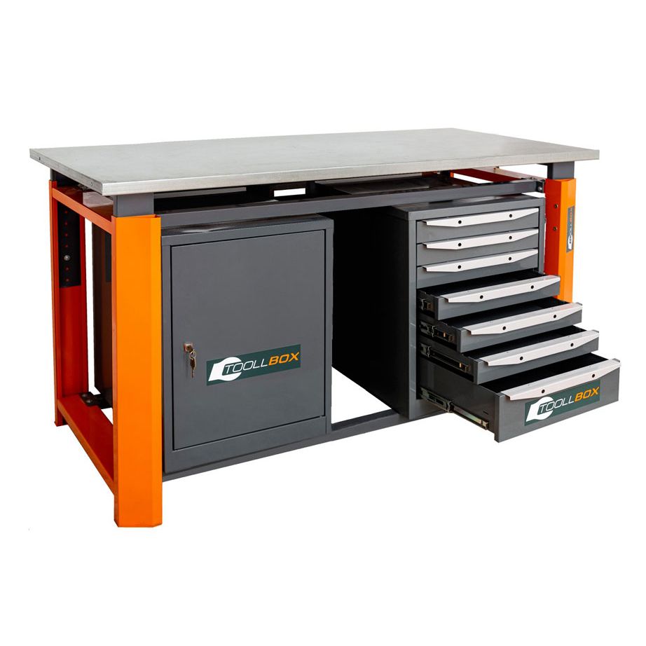 Верстак ТВР1800 (ТВ0-ТВ7) — это продуманное рабочее место для мастерской, сервиса или производственного участка, где важно держать под рукой и инструмент, и расходные материалы, и при этом иметь по-настоящему прочную поверхность для ежедневной работы. Модель выполнена в двухтумбовом комбинированном формате: с одной стороны расположен блок из семи выдвижных ящиков, с другой — тумба с полками и дверцей. Такое решение удобно для тех, кто ценит порядок и хочет грамотно распределить хранение по назначению.
