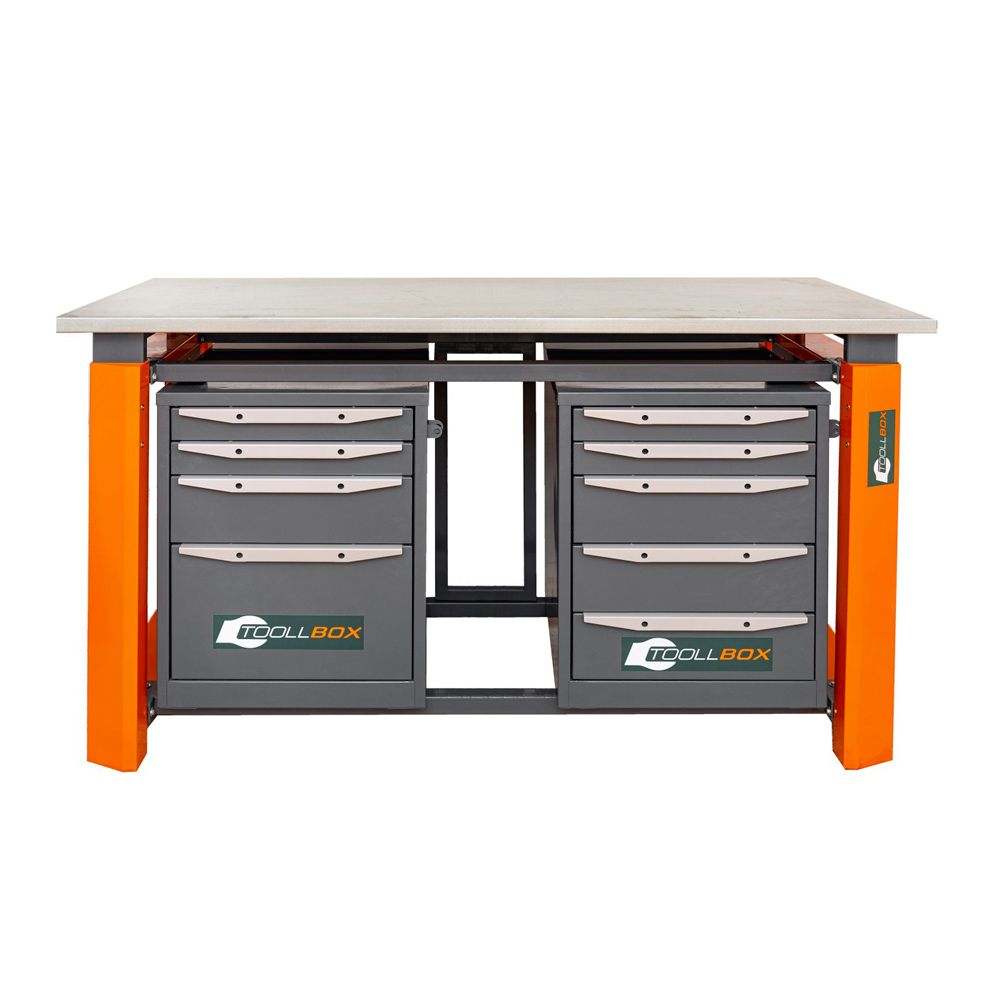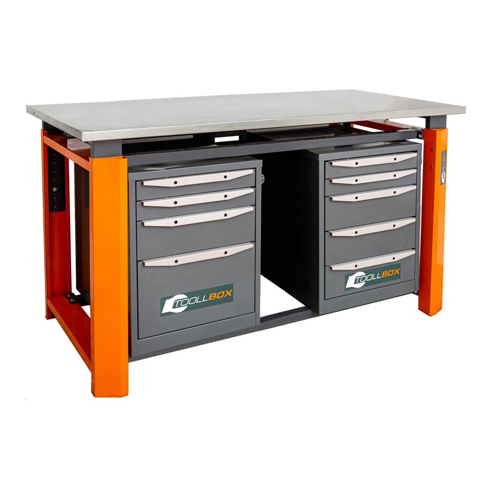 Верстак ТВР1800 (ТВ4-ТВ5) — это вместительное и по-настоящему удобное рабочее место для мастерской, сервисной зоны или производственного участка, где важно держать инструмент под рукой и не переживать за устойчивость конструкции. Двухтумбовое исполнение делает модель особенно практичной: с одной стороны расположена тумба с четырьмя выдвижными ящиками, с другой — тумба с пятью ящиками. Такой формат помогает грамотно разложить оснастку, расходники и ручной инструмент, не превращая рабочую зону в хаос.