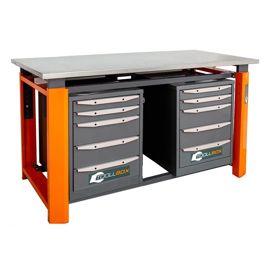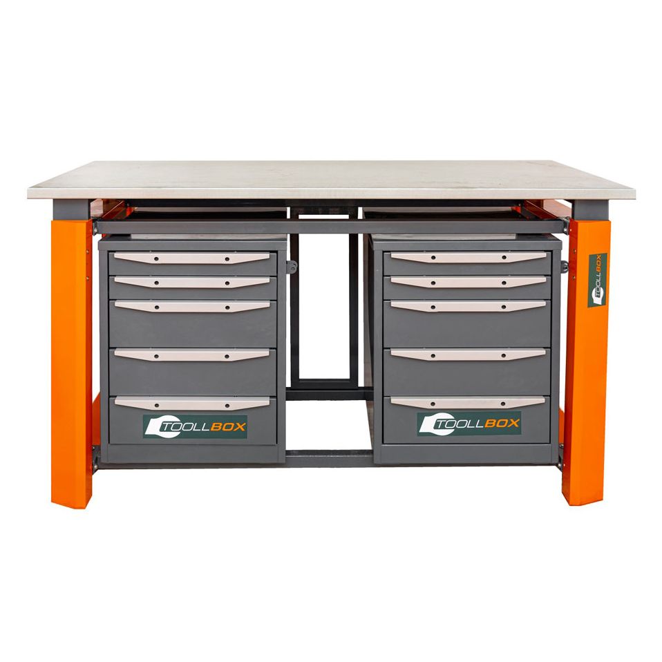 Верстак комплектуется двумя тумбами ТВ5, каждая из которых оснащена пятью выдвижными ящиками. В сумме получается десять ящиков, благодаря которым все необходимое остается под рукой, а рабочее пространство сохраняет порядок. Такая компоновка особенно удобна там, где важно разделить инструмент по назначению, частоте использования или типу выполняемых операций.