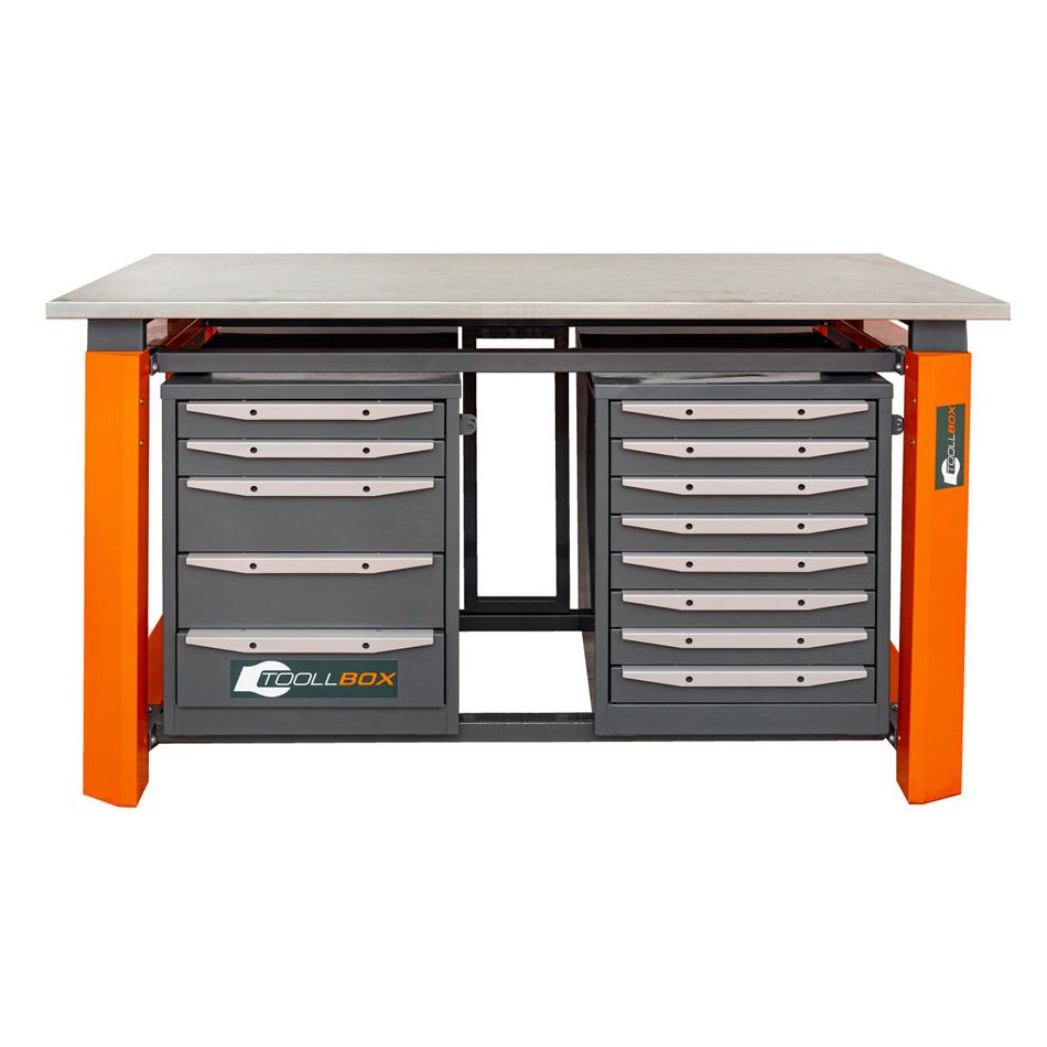 Верстак ТВР1800 (ТВ5-ТВ8) — это вместительное и продуманное рабочее место для мастерской, производственного участка или ремонтной зоны, где важно держать инструмент под рукой и не терять время на лишние перемещения. Модель выполнена в двухтумбовом комбинированном исполнении: с одной стороны установлена тумба с пятью выдвижными ящиками, с другой — тумба с восемью ящиками. Такое решение удобно для раздельного хранения оснастки, ручного инструмента, крепежа и расходных материалов.
